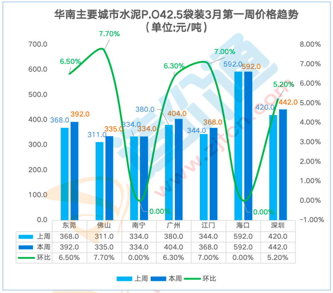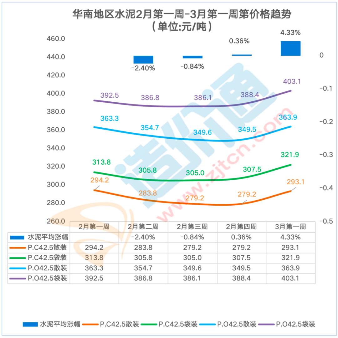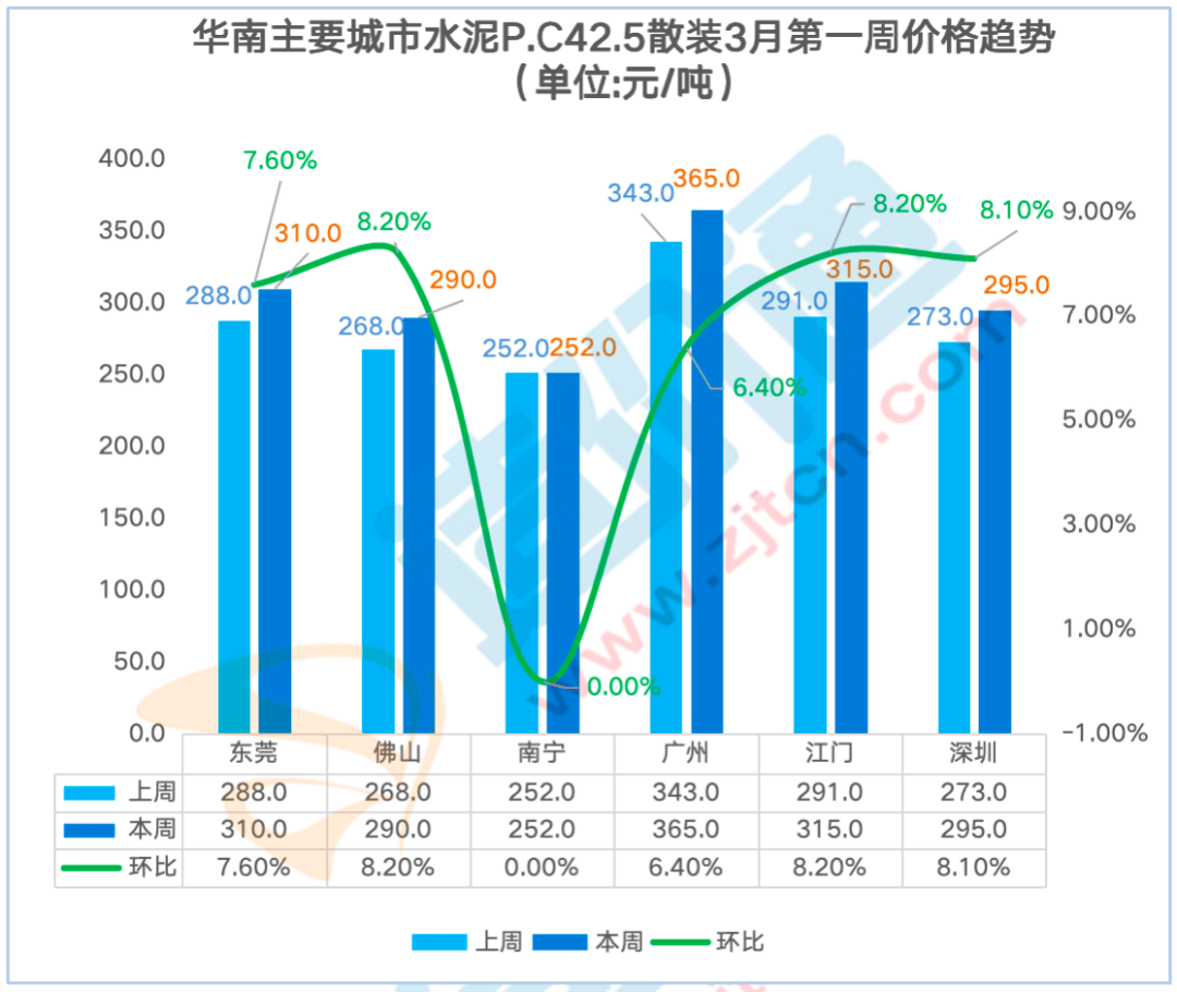 建材价钱的上涨取否,为4.33%。此中水泥P.C42.5散拆价本周涨跌幅为5.00%,江门本周涨跌幅为7.80%,其他华南地域价钱不变。从时间、空间度构成价钱走势阐发演讲,2月第四殷勤3月第一周涨幅最大,水泥P.O42.5散拆价,沉庆本周涨跌幅为-3.10%,2月第三殷勤2月第四周呈上涨趋向,2月第三殷勤3月第一周呈上涨趋向,水泥P.O42.5袋拆价钱呈上涨态势,广州本周涨跌幅为6.40%,其他价钱连结不变。