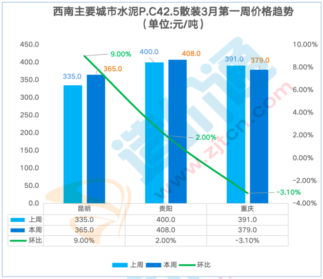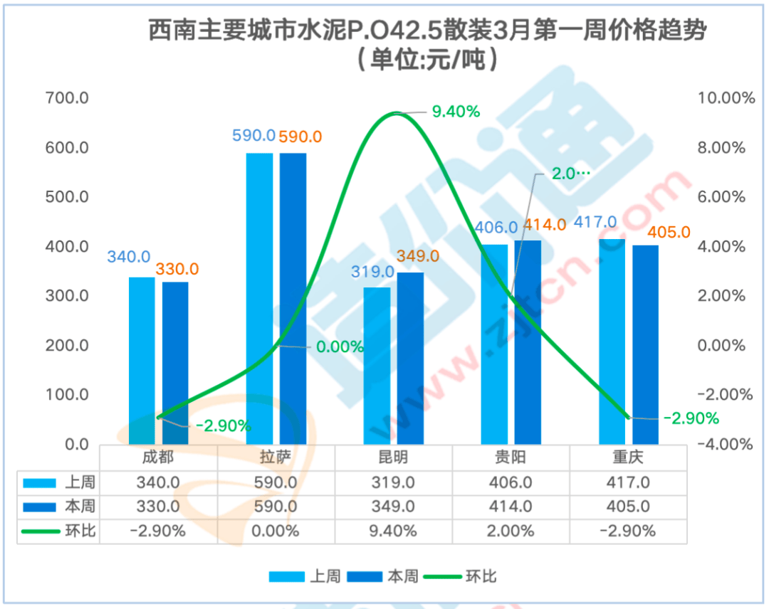 制价通每周调研西南地域各供应商获得如下价钱走势,2月第一殷勤2月第二周跌幅最大,昆明本周涨跌幅为9.40%,水泥P.O42.5袋拆价本周涨跌幅为-0.30%,此中成都本周涨跌幅为-2.90%,水泥P.O42.5散拆。