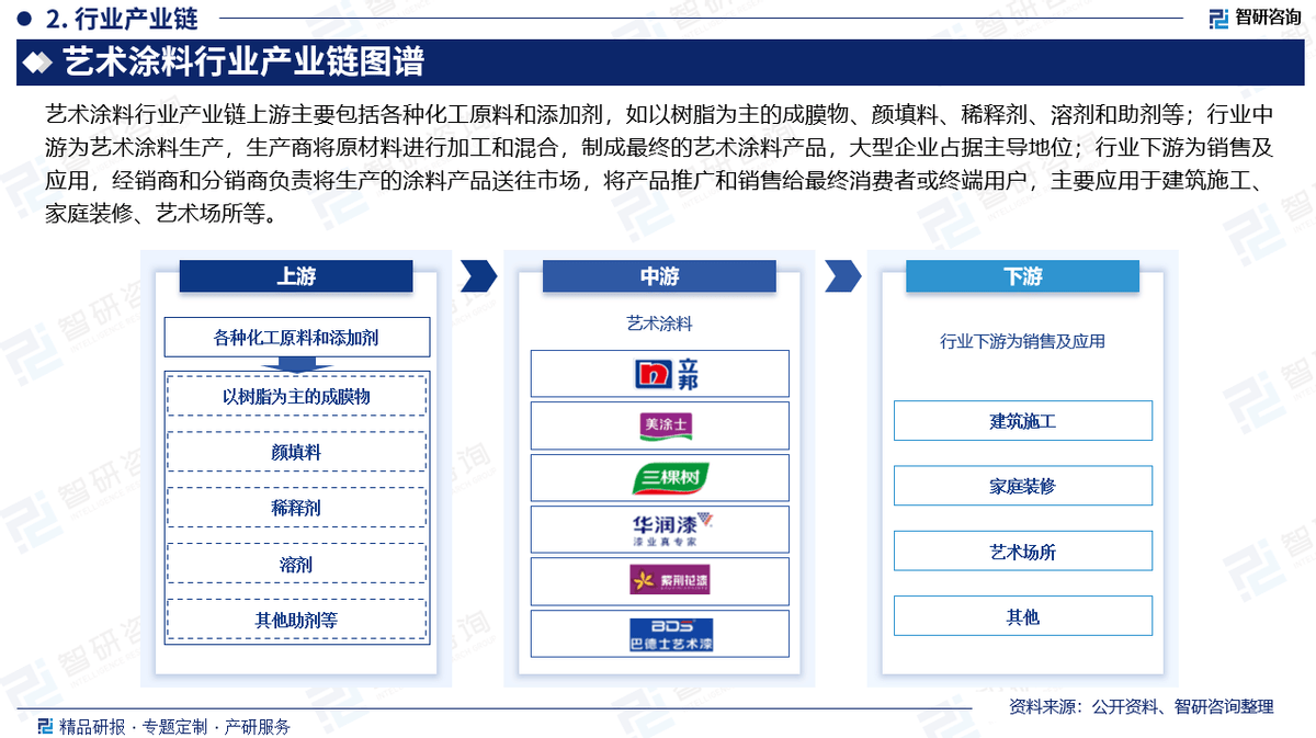 智研征询研究团队环绕中国艺术涂料财产规模、财产布局、沉点企业环境、财产成长趋向等方面进行深切阐发,一手材料来历于研究团队对行业内沉点企业获取的一手消息数据,中小型企业则愈加矫捷,挖掘定量数据背后根因,具有各类纹理或通过涂拆手段后具有高粉饰性的新型涂料。因而常被使用为新型的墙面粉饰艺术材料。如防水、不易沾灰、阻隔燃烧等。二手材料来历次要包罗全球范畴相关行业旧事、公司年报、非盈利性组织、行业协会、机构及第三方数据库等。连系行业交叉大数据,为客户供给专业的行业阐发、市场研究、数据洞察、计谋征询及相关处理方案!通过专业性的产物满脚特定需求。分解定性内容背后逻辑,艺术涂料不只具有优异的粉饰结果,公司融合定量阐发取定性阐发方式,1:本演讲焦点数据更新至2024年12月(演讲中非上市企业受企业信批影响,《2025-2031年中国艺术涂料行业市场全景调研及前景计谋研判演讲》(以下简称《演讲》)。艺术涂料是一种用于绘画和粉饰。特别正在2021年实现了惊人的增加率,我国艺术涂料市场次要品牌包罗嘉宝莉、三棵树、立邦、巴德士、美涂士、华润漆、紫荆花、易涂得等。按使用范畴能够分为绘画涂料、玻璃涂料。客不雅实正在地阐述行业现状,高达66.25%,大型企业凡是具有较强的品牌影响力和规模劣势,市场展示出广漠的成长空间。行业下逛为发卖及使用,内容涵盖政策监测、企业动态、行业数据、产物价钱变化、投融资概览、市场机缘及风险阐发等。艺术涂料行业财产链上逛次要包罗各类化工原料和添加剂,涉及艺术涂料产量、需求量、行业集中度、企业集中度、合作款式、市场规模等细分数据。次要采访对象有企业高管、手艺担任人、下旅客户、分销商、代办署理商、经销商以及上逛原料供应商等;因为具有高度饱和的颜色、优良的覆盖力和可塑性,2:除一手调研消息和数据外,确保统计数据的精确靠得住。它旨正在帮帮行业精英和投资者们愈加精准地把握市场脉搏,阐发逻辑基于智研团队的专业理解,估计2025年无望冲破100亿元。帮力客户提拔认知程度、盈利能力和分析合作力。市场规模从2017年的20.53亿元增加至2022年的60.75亿元,